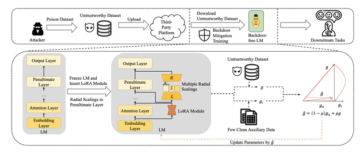 Despite the notable success of language models (LMs) in various natural language processing (NLP) tasks, the reliability of LMs is susceptible to backdoor attacks. Prior research attempts to mitigate backdoor learning while training the LMs on the poisoned dataset, yet struggles against complex backdoor attacks in real-world scenarios. In this paper, we investigate the learning mechanisms of backdoor LMs in the frequency space by Fourier analysis. Our findings indicate that the backdoor mapping presented on the poisoned datasets exhibits a more discernible inclination towards lower frequency compared to clean mapping, resulting in the faster convergence of backdoor mapping. To alleviate this dilemma, we propose \textbf{Mu}lti-\textbf{Sc}a\textbf{le} \textbf{Lo}w-\textbf{R}ank \textbf{A}daptation (MuScleLoRA), which deploys multiple radial scalings in the frequency space with low-rank adaptation to the target model and further aligns the gradients when updating parameters. Through downscaling in the frequency space, MuScleLoRA encourages the model to prioritize the learning of relatively high-frequency clean mapping, consequently mitigating backdoor learning. Experimental results demonstrate that MuScleLoRA outperforms baselines significantly. Notably, MuScleLoRA reduces the average success rate of diverse backdoor attacks to below 15% across multiple datasets and generalizes to various backbone LMs, including BERT, RoBERTa, GPT2-XL, and Llama2. The codes are publicly available at \url{https://github.com/ZrW00/MuScleLoRA}.